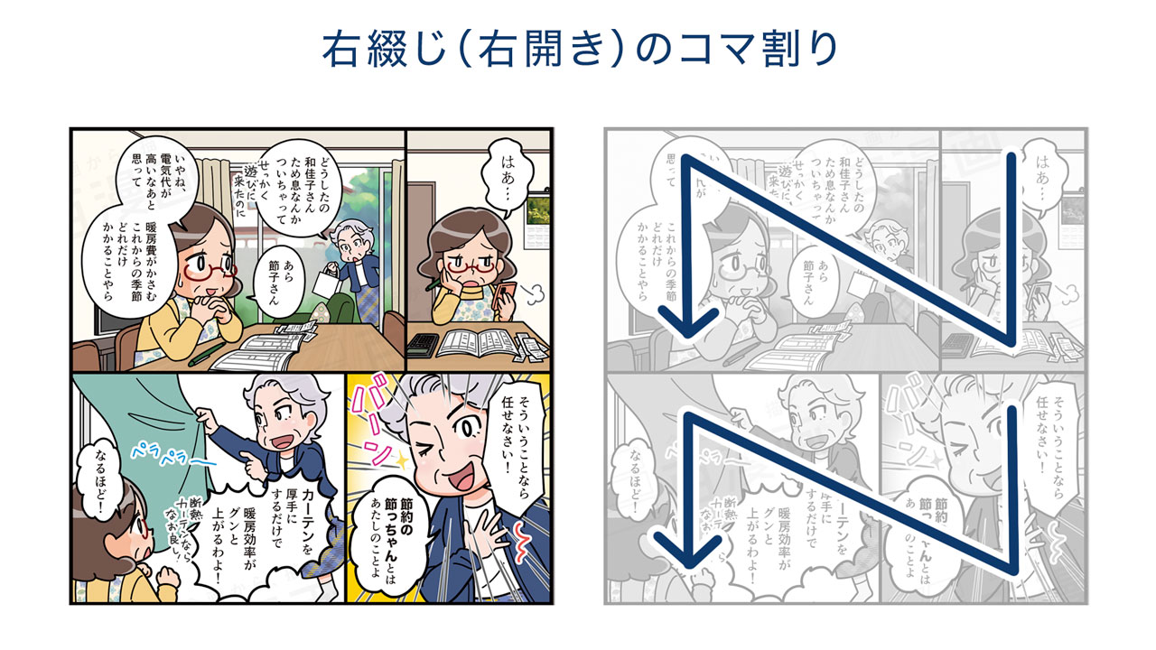 基本的には右綴じタイプのコマ割りの考え方を左綴じに置き換えて応用すればいいのですが、やはり描き慣れていないとなかなか難しいです。