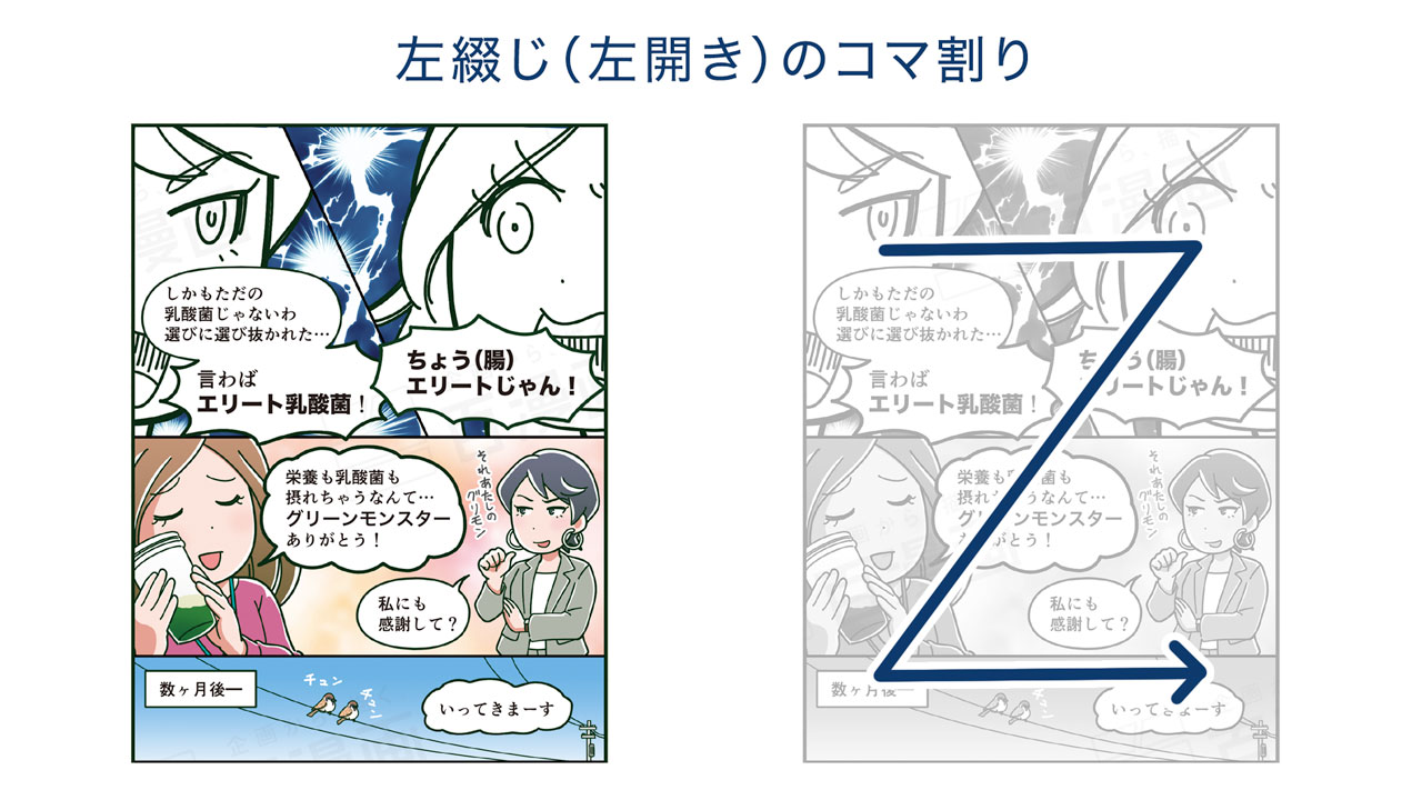 しかし横書きの文字で構成される冊子やパンフレット、WEBサイトに漫画を掲載する際など、横書きで左上から右下へと読んでいく左綴じ(左開き)の漫画を利用した方がよい場合もあります。