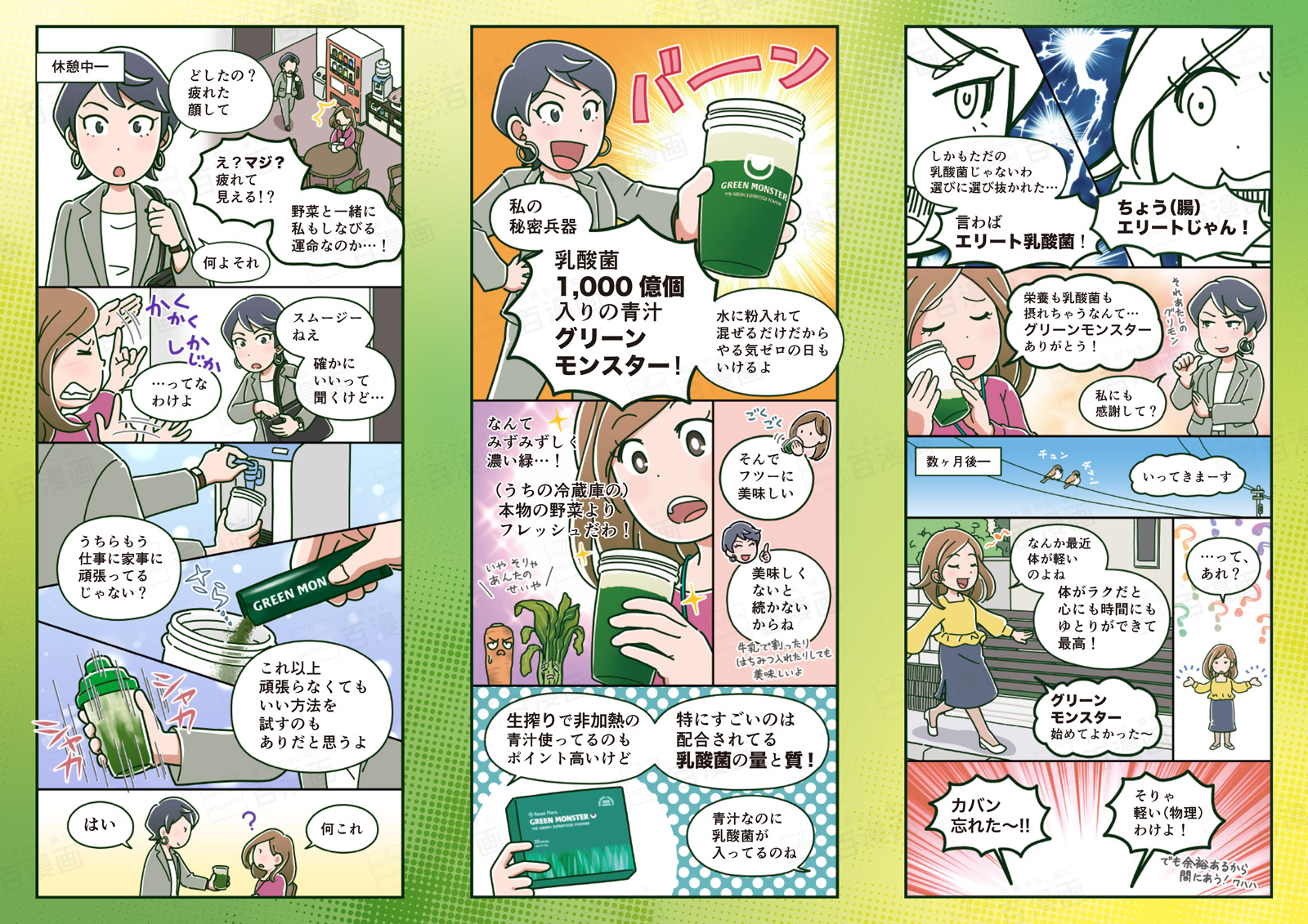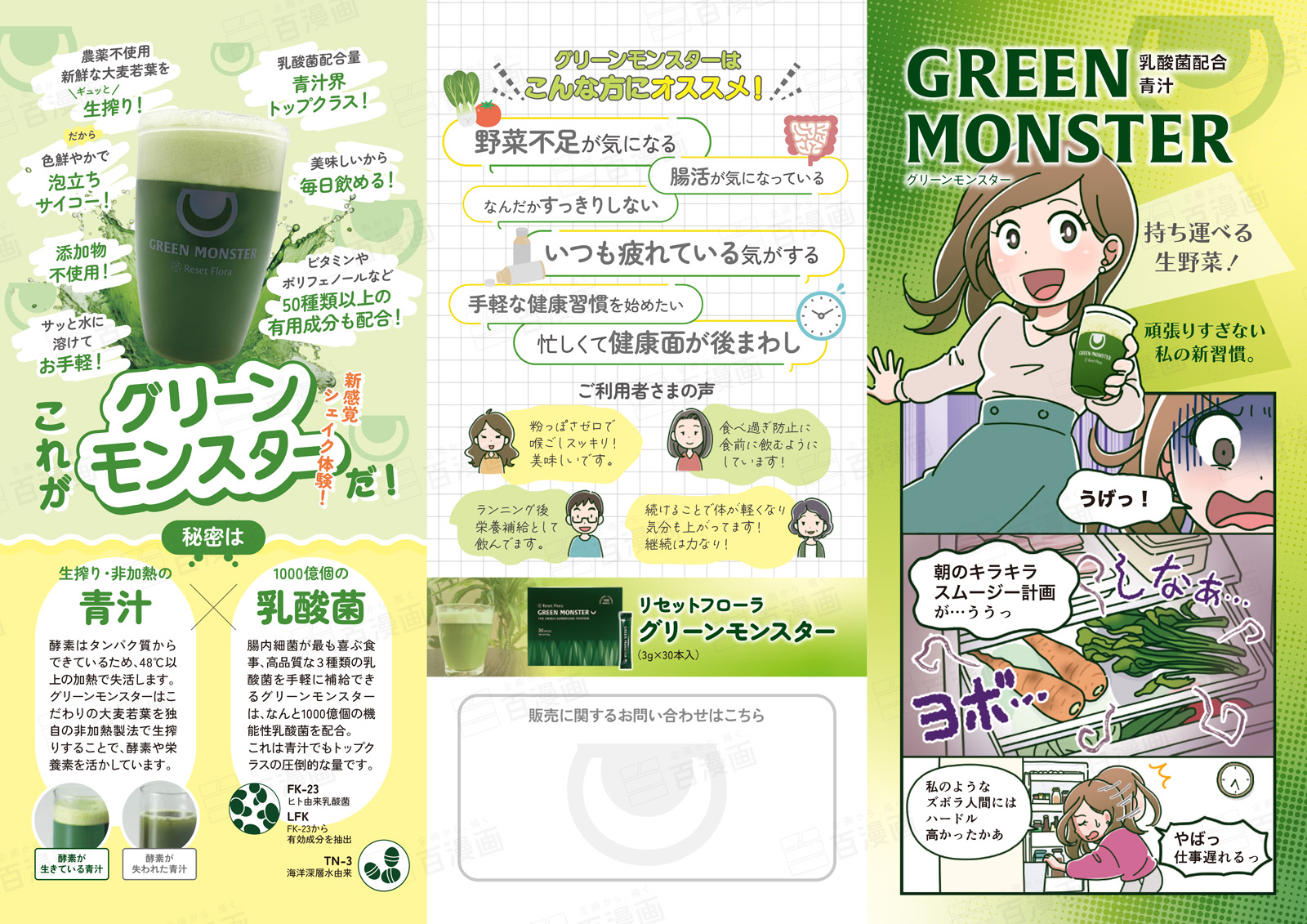 制作物詳細乳酸菌配合青汁『GREEN MONSTER』三つ折りパンフレット